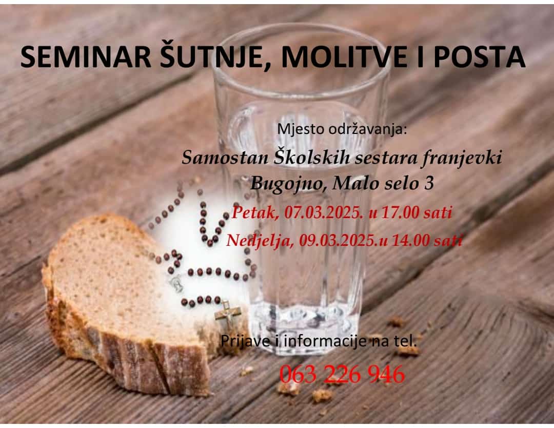 Seminar šutnje, molitve i posta održat će se u Duhovnom centru Školskih sestara franjevki u Bugojnu. Seminar započinje u petak 7. ožujka u 17 sati, a završava u nedjelju 9. ožujka u 14 sati. Voditeljica seminara je s. Vlatka Dujmović. Prijave i informacije možete dobiti na broj 063 226 946
