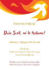 U subotu, 7. lipnja 2025. u dvorištu duhovnog centra Školskih sestara franjevki u Bugojnu bit će upriličeno Duhovsko bdijenje pod geslom “Duše Sveti, mi te trebamo”.
