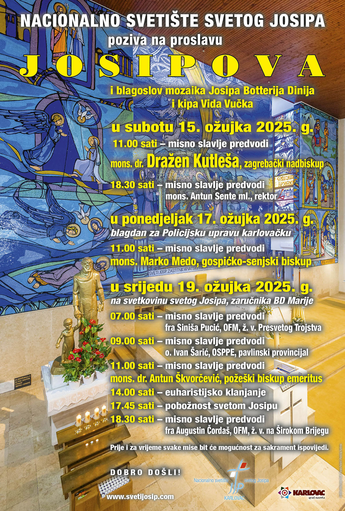U Nacionalnom svetištu sv. Josipa u Karlovcu u subotu 15. ožujka misu u 11 sati predslavit će zagrebački nadbiskup Dražen Kutleša. Prije i za vrijeme svake mise bit će mogućnost za sakrament ispovijedi. Na proslavu Josipova (15. ožujka) hodočasti i pedeset naših župljana, koje vodi naša s. Vlatka Dujmović. Neka im bude sretan put i plodonosno hodočašće, na slavu Božju!